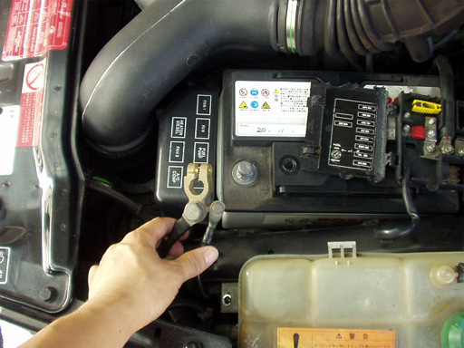 先にプラス端子をソケットレンチで締め、後にマイナス端子をスパナで締める。