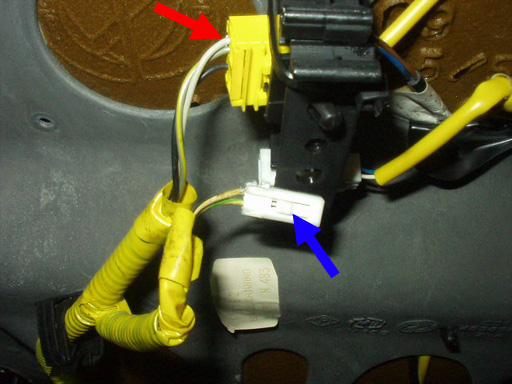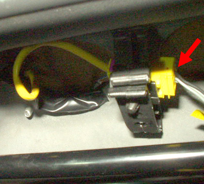 助手席側シート下 黄色はエアバッグのコネクタ、白は着座センサーのコネクタ。