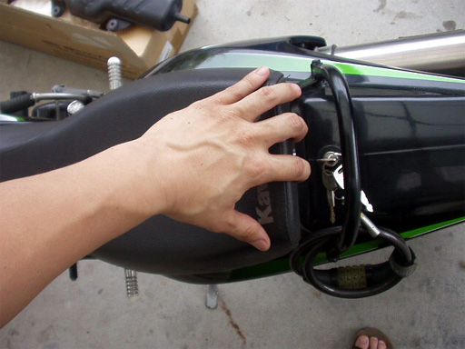 それぞれボルトを外し、シートカウルと右シュラウドを取り外しました。