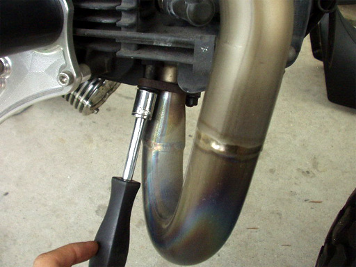 マフラー本体取り外し。オールチタン製ですので非常に軽いです。