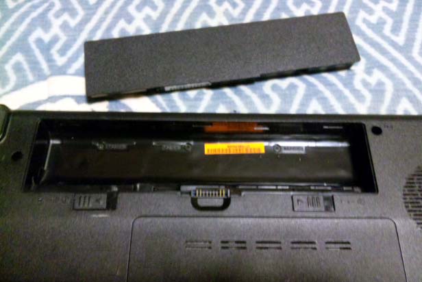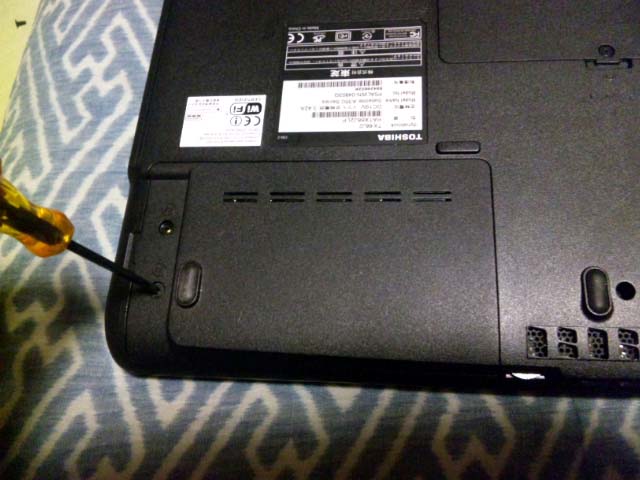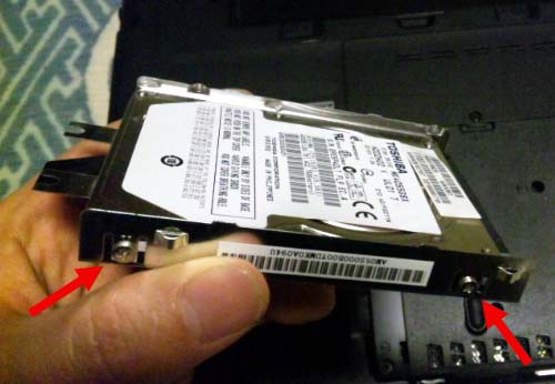 東芝製400GBの2.5インチハードディスク。ねじを4本外してマウンタから取り外します。