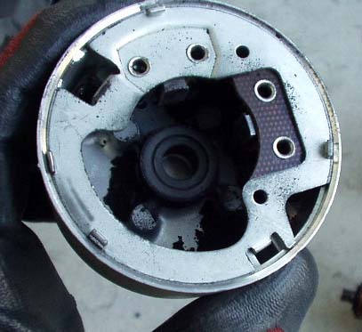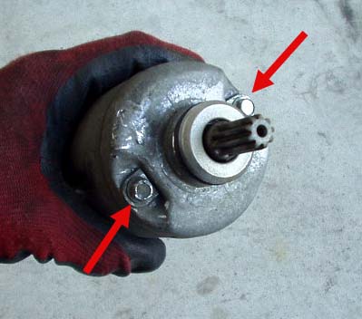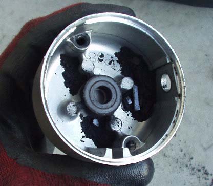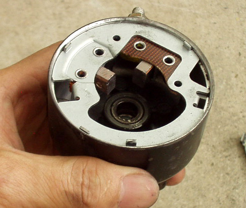 取り外したセルモーターを分解清掃。カーボンブラシの削りかすがたくさん。消耗も進んでいました。