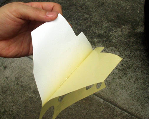デカールを台紙から剥がし、糊面にも洗剤液を吹き付け。柄を合わせ、ゴムヘラで密着させました。