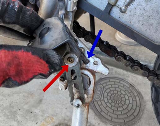 サイドスタンドセンサースイッチカバーを固定するボルトを外し、樹脂のはめ込みを抜きます。